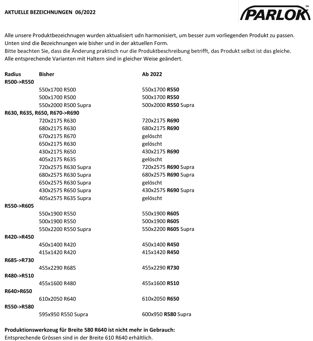 Letztes Jahr 2021 haben wir das gesamte Artikelnummersystem für unsere Produkte grundlegend geändert. Gleichzeitig wurden alle Produktbeschreibungen standardisiert aber es blieb noch für dieses Jahr notwendig einige Abmessungsinformationen ua. Länge und Radius sowie daraus resultierende Spanne und Höhe unserer Kotflügel zu korrigieren. Dabei wurden auch gewisse Standardgrössen aus dem Sortiment gelöscht, dafür werden aber einige neue nützliche Grössen eingeführt.